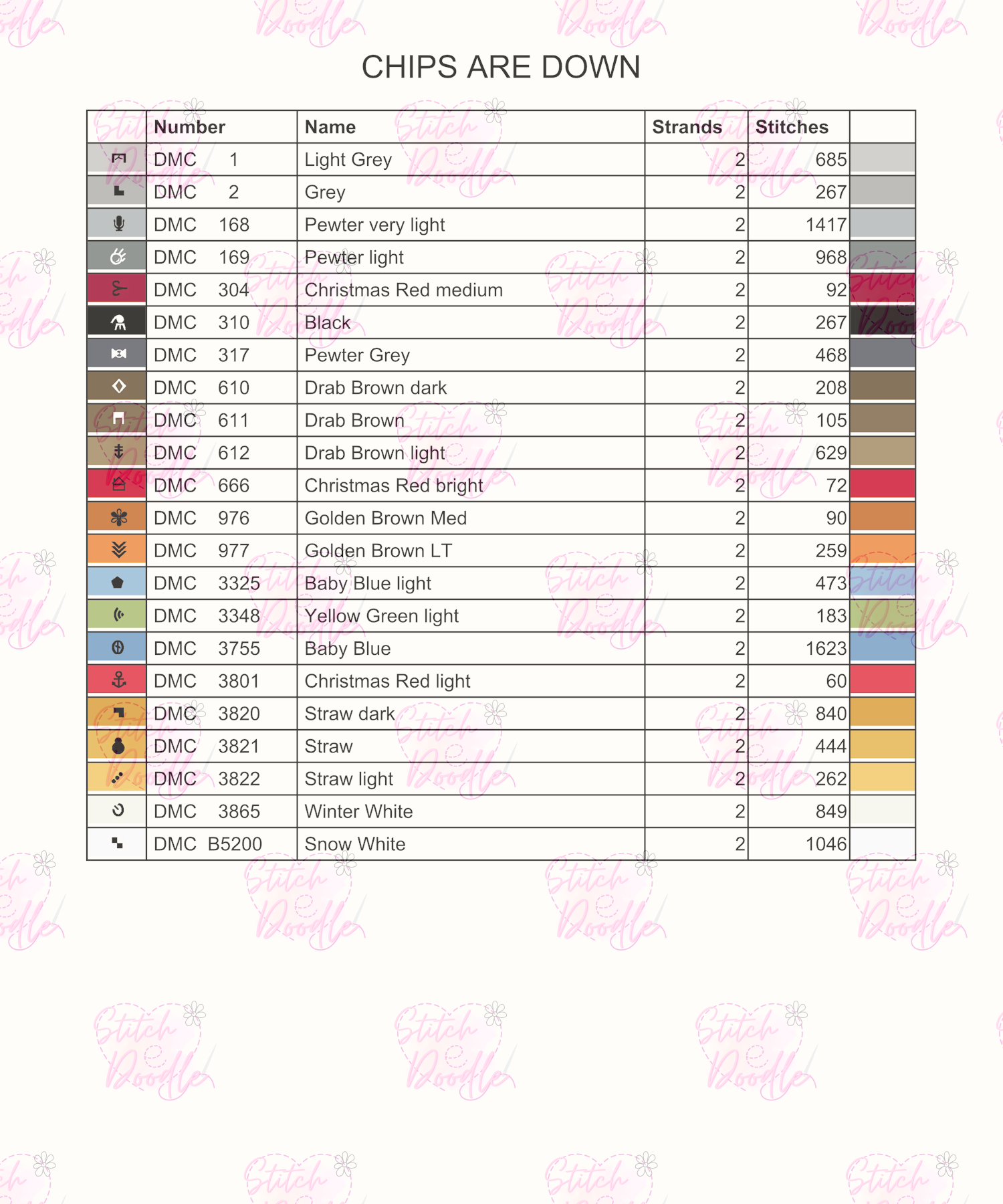 - PDF file with colour/color blocks and symbols and black and white symbols. Large easy to read charts.
